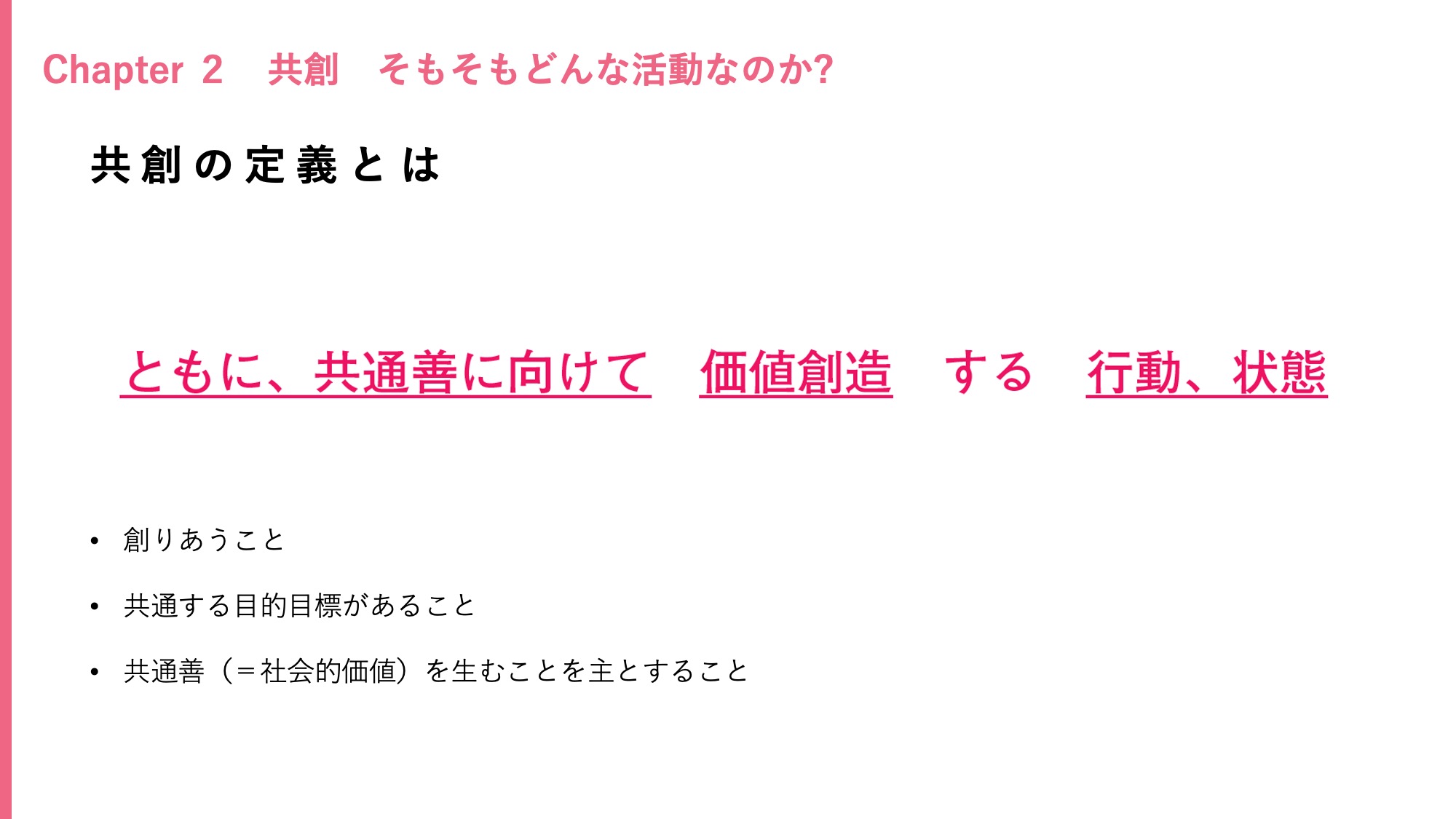 この本では、共創を「ともに、共通善に向けて価値創造する行動、状態」と定義しました。