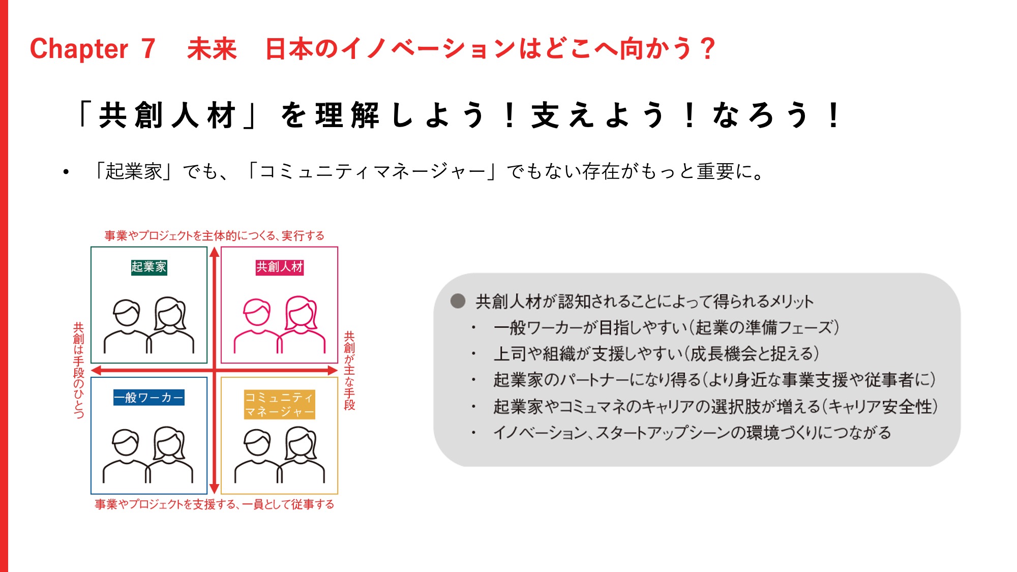 そこで、場を盛り上げ、ときには起業家をフォローし、事業やプロジェクトに直接関わる人材を「共創人材」と定義しました。この「共創人材」を増やすことが、企業を牽引する次世代人材の育成にもつながるのではないでしょうか。
