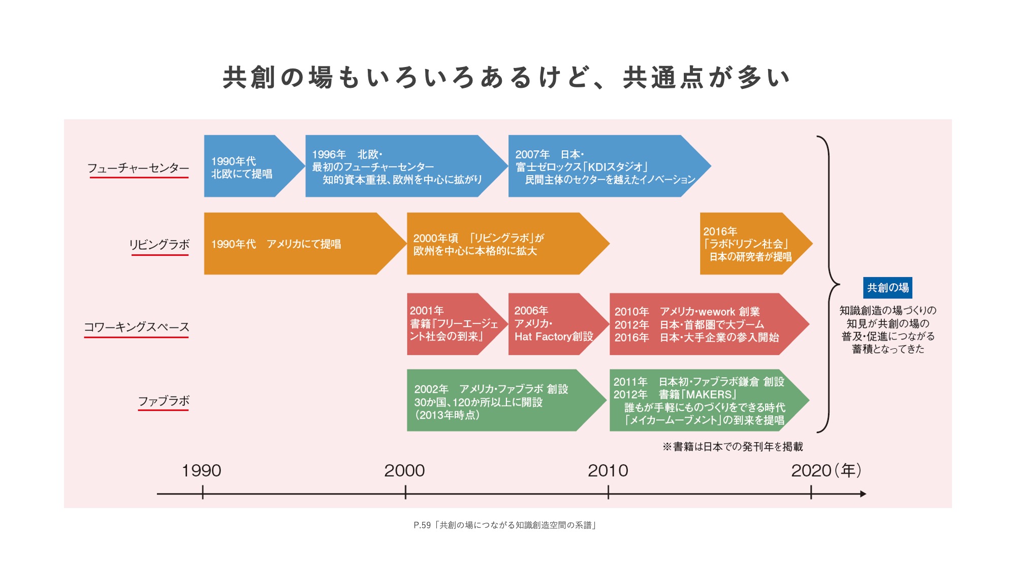 たとえば、企業と大学の産学共創や市民主体の市民共創。共創を支援する場も、フューチャーセンターやリビングラボ、コワーキングスペース、ファブ・ラボなどがある。