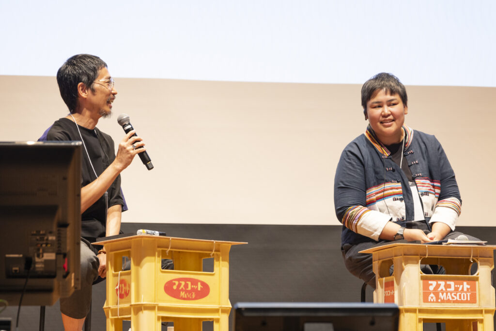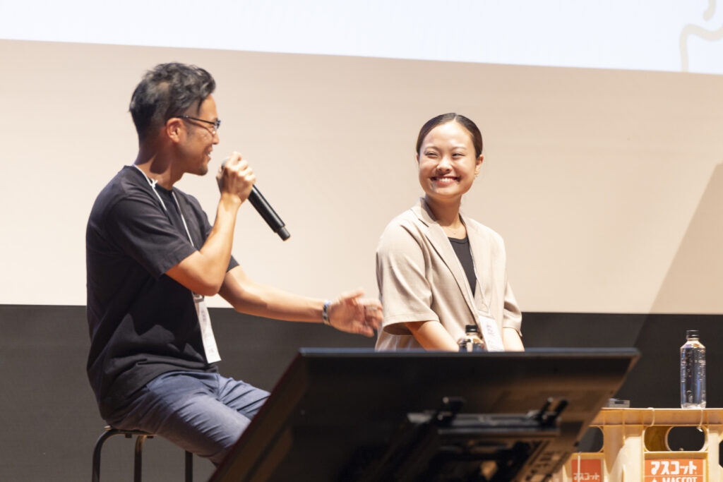 長い一日を締めくくるクロージングトークは、大阪・関西万博の誘致から関わってきた2人が登壇。「パノラマティクス」主宰で、大阪・関西万博 EXPO共創プログラムディレクターの齋藤精一さん、demo!expo副代表の今村治世さんが、万博関連の活動や社会現象を振り返り、大阪で培われた知見を次世代や今後の万博へどうつないでいくか語り合いました。