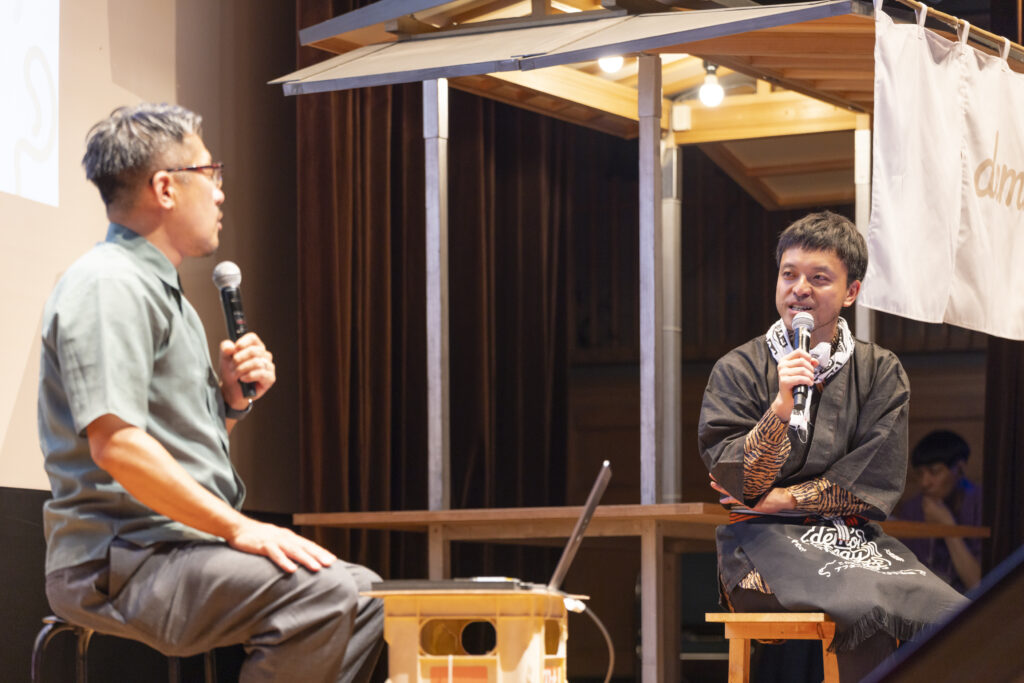 迎えるは、大阪を拠点とするクリエイティブユニット「graf」の代表でクリエイティブディレクターの服部滋樹さんと、demo!expo理事で株式会社人間のアイデアマン、山根シボルさん。服部さんは「grafはデザインするだけでなく、“仕事をつくってきた”チーム。プロジェクト→プログラム→ムーブメント→カルチャーの流れで活動を展開している」と自己紹介。山根さんは、万博を機に多数のお菓子屋と共創した新しい羊羹「大阪ええYOKAN」などの活動で、「大阪らしさ」に考えをめぐらせてきたと振り返りました。