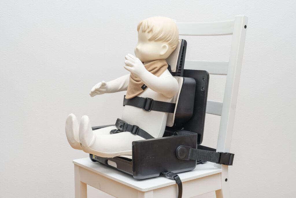 姿勢保持が必要な子どもが外出先で座る際に、身体を安定させて食事や遊びを楽しめるようサポートする椅子です。