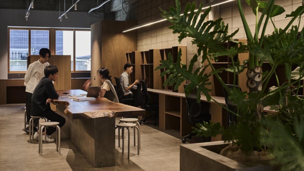 奥へ進むと、一枚板の大きなテーブルが中央に据えられた、シェアオフィス空間が広がる。「静かに閉じる」ではなく「心地よく開く」ことを意識した設計で、座った人同士が自然に声を交わせる距離感が特徴だ。KURUのデザイナーやスタッフも日常的にオフィスへ出入りしており、相談ごとや協業のきっかけが生まれているという。