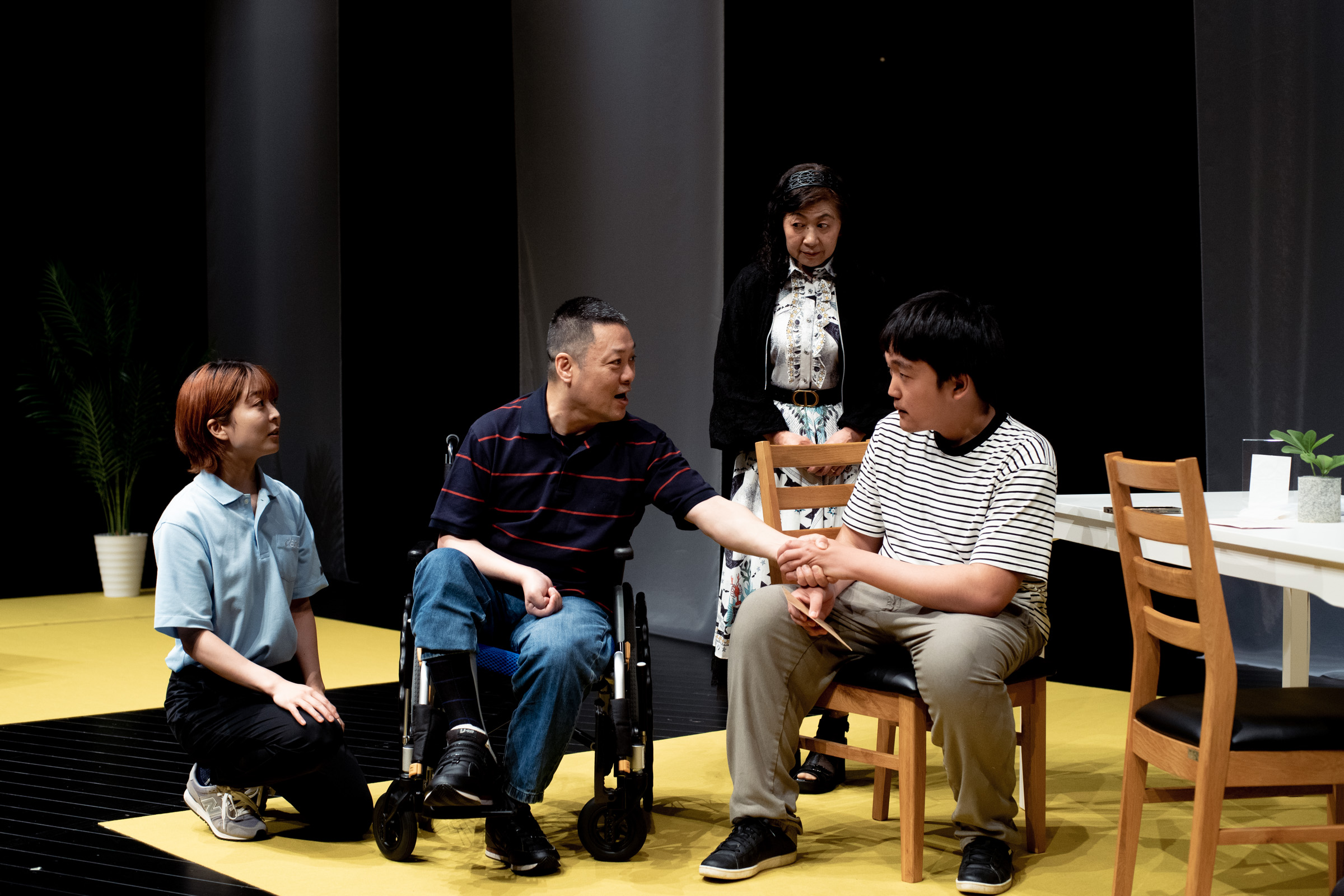 僕が脚本・演出を担い、舞台に立つのは障がいをもつ方や高齢者、その家族や介護士など。役者経験はほとんどない10代~90代の方たちと一緒に演劇を作っています。