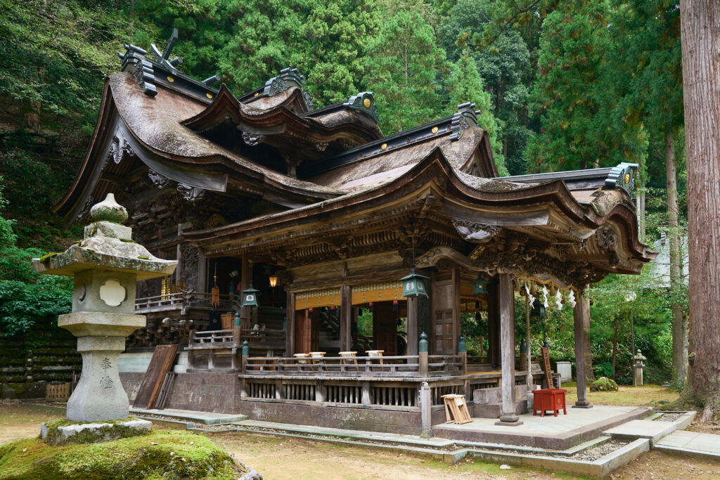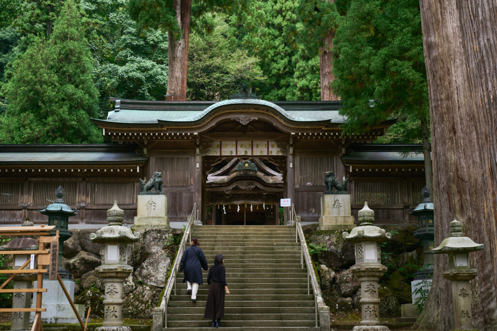 栁瀨良三製紙所をあとにし、風情ある通りをのんびり歩いていくと、木々の間に壮麗な社殿が見えてきました。紙の神様を祀る「岡太(おかもと)神社・大瀧神社」です。