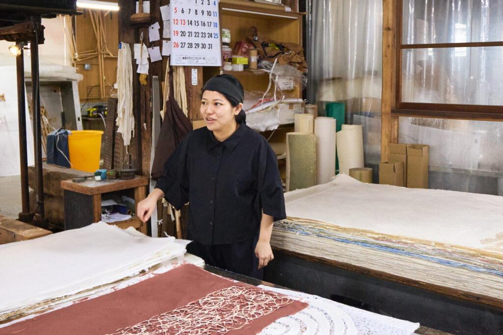 紙の完成を待つ間、代表の柳瀬靖博さんが工房の中を案内してくれました。作業場では、女性の職人たちが手際よく紙を漉いています。