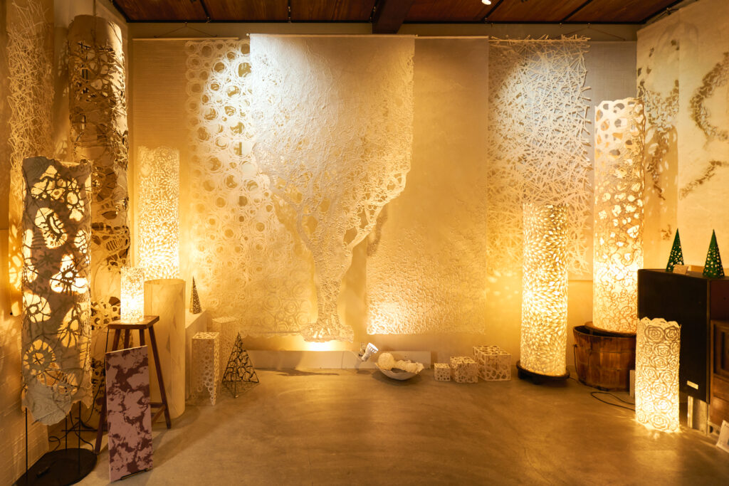 その唯一無二の和紙は、東京・日本橋高島屋のエントランスや成田空港、インターコンチネンタルホテル大阪の空間を彩り、さらにフランスの香水・化粧品メーカー「ゲラン(GUERLAIN)」のショーウインドウにも採用されるほど。