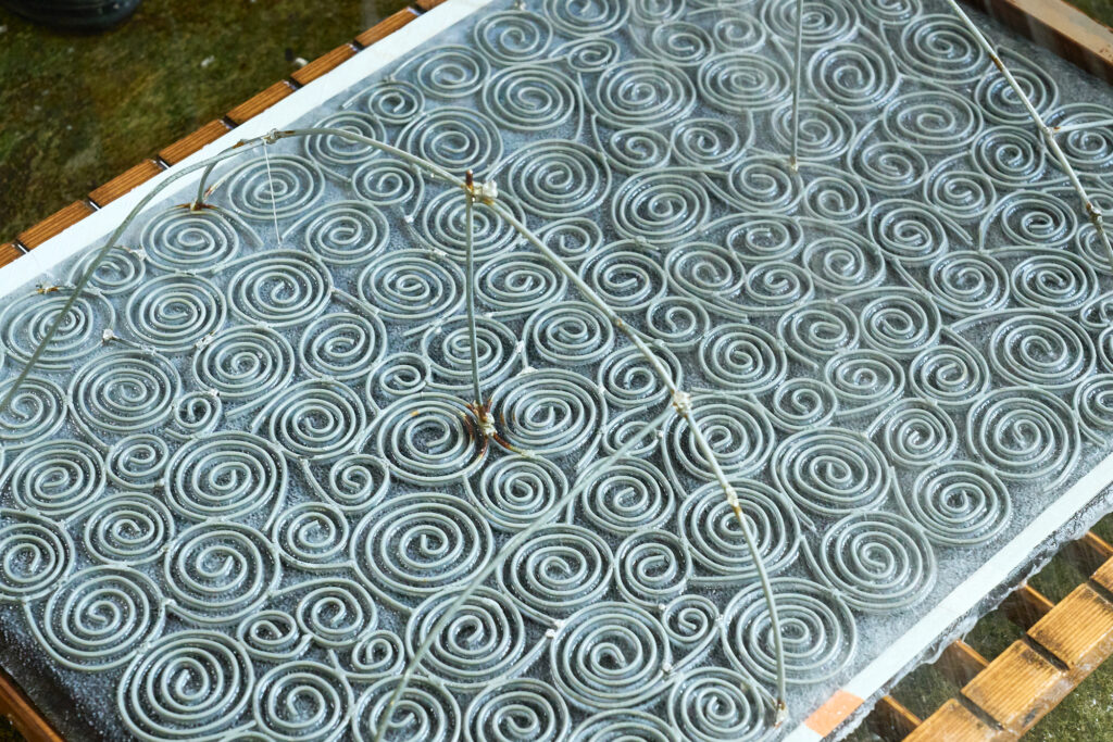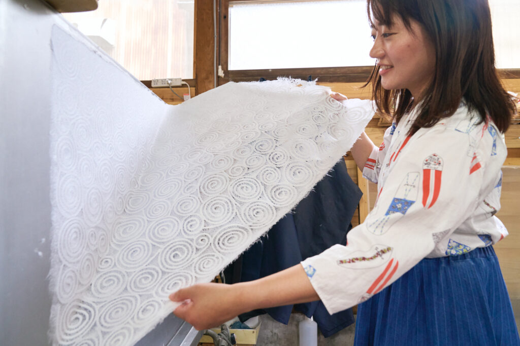 今回体験したのは、金型落水紙(かながたらくすいし)の紙漉き。光と影が織りなすレースのような文様が特徴で、和菓子のパッケージや包装紙などに使われることが多いそうです。