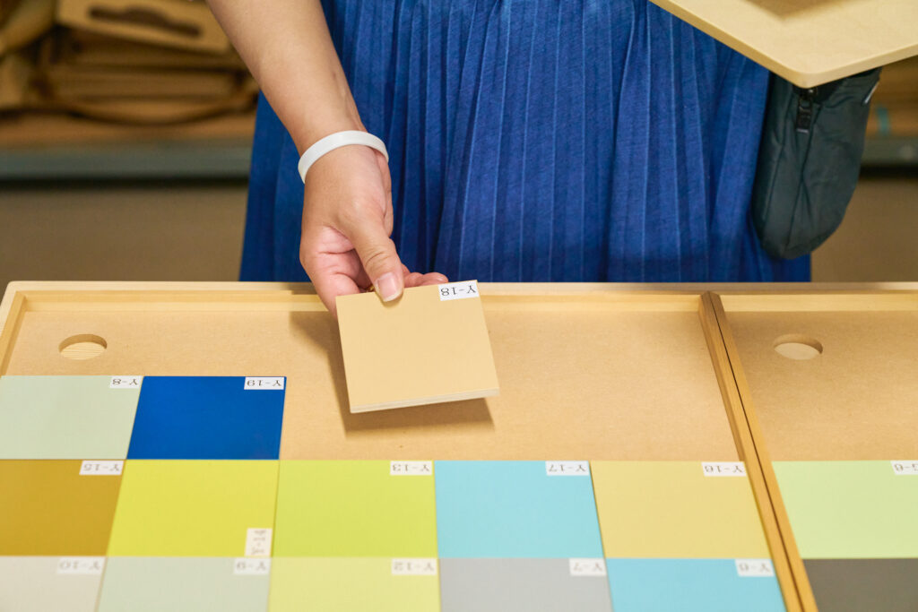 まず井上徳木工で木地を選び、約60色の中から好みの塗り色を2色セレクト。その後、同じ河和田地区で漆器の吹付塗装を手がける「丸廣意匠」に移動して、世界にひとつだけの器を完成させます。