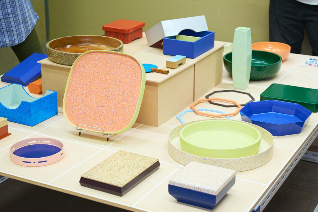 まさに、“工房をハシゴする”体験。産地ならではの贅沢なワークショップです。テーブルの上には、角皿、丸皿など大小さまざまな木地がずらり。