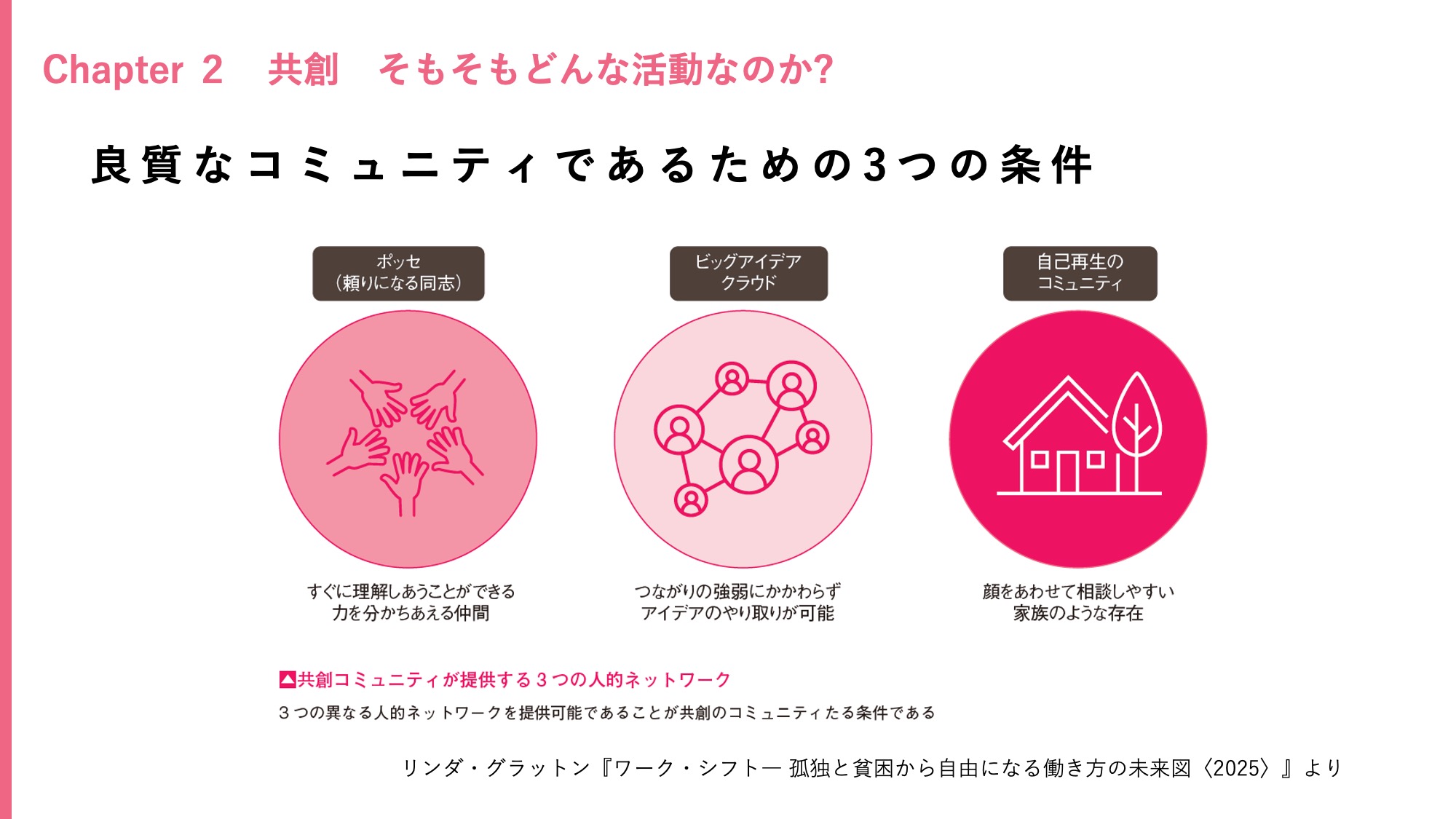 15年ほど前、リンダ・グラットンさんが書籍『ワーク・シフト』で述べていた、これからの働き方に重要な3つのコミュニティから引用しています。