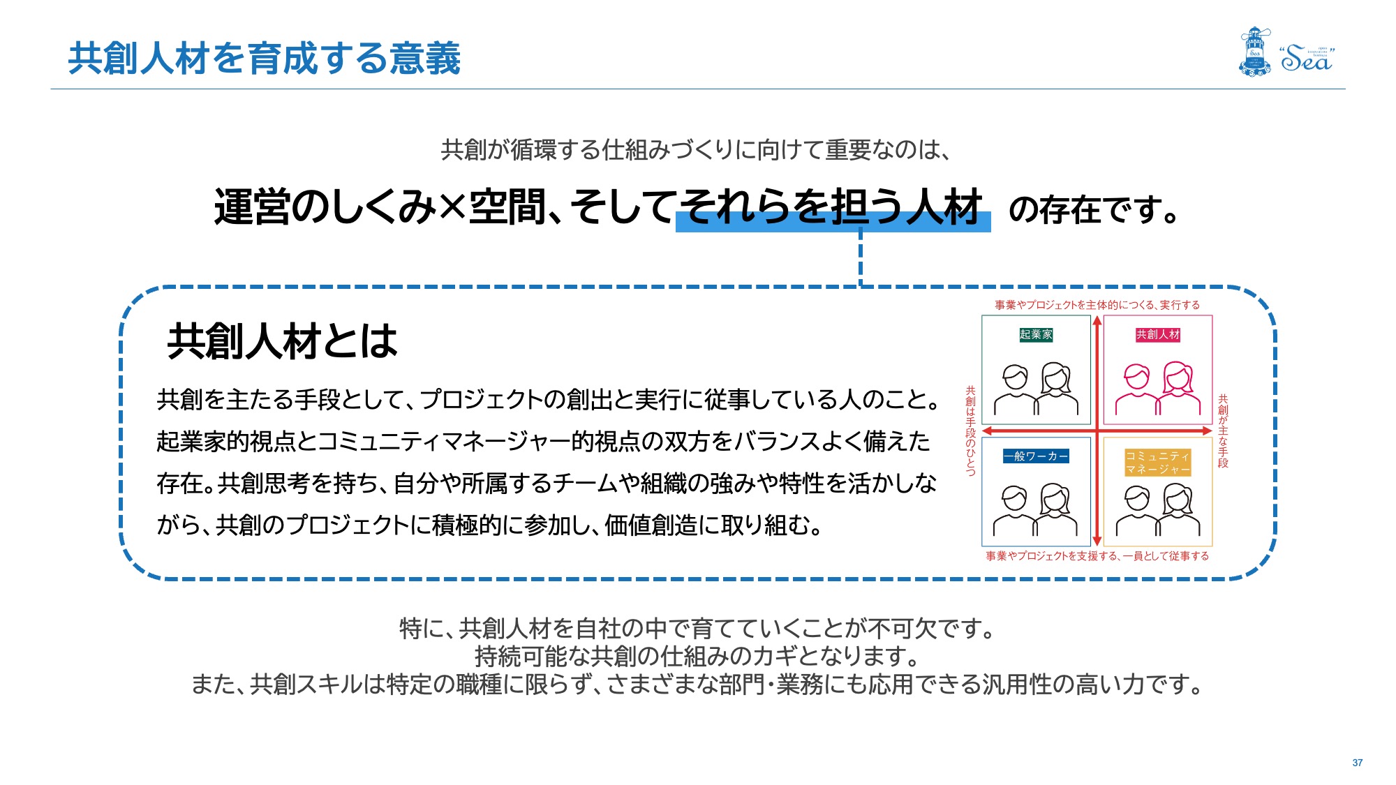 そのため、主体的な意識を持って共創に取り組む人をまずは社内で増やしていくことが必要。