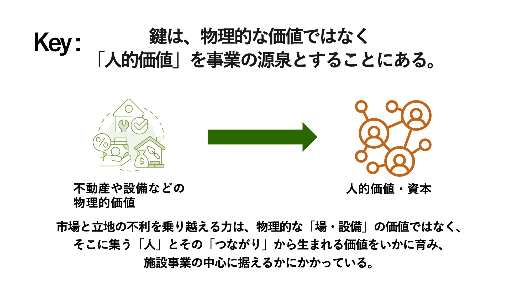 「鍵は、物理的な価値ではなく『人的価値』を事業の源泉とすることにある」ということですね。