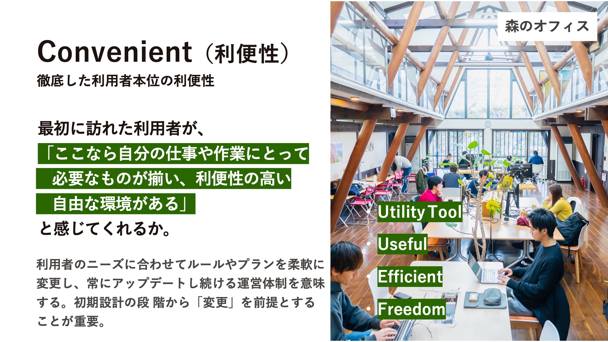Convenientは分かりやすいと思います。利用者が「ここは自由だ」と感じられるストレスのない環境です。その利便性がきちんと満たされるとConvivial(共生)に移行する。