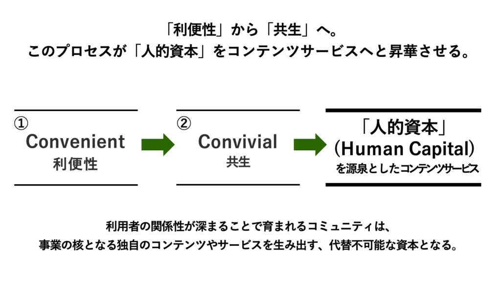 こういった人的資本は、「利便性(Convenient)」と「共生(Convivial)」2つの体験設計から生まれると考えています。