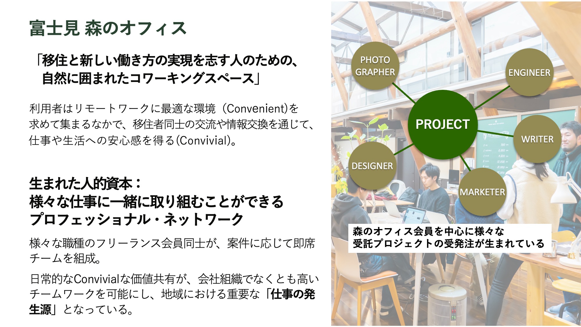 森のオフィスでは、カメラマンやライター、デザイナー、マーケターなど腕の良いクリエイターが多数在籍しており、都心から仕事が来た際、彼らが集まれば一つの広告代理店のような機能を持たせることができます。