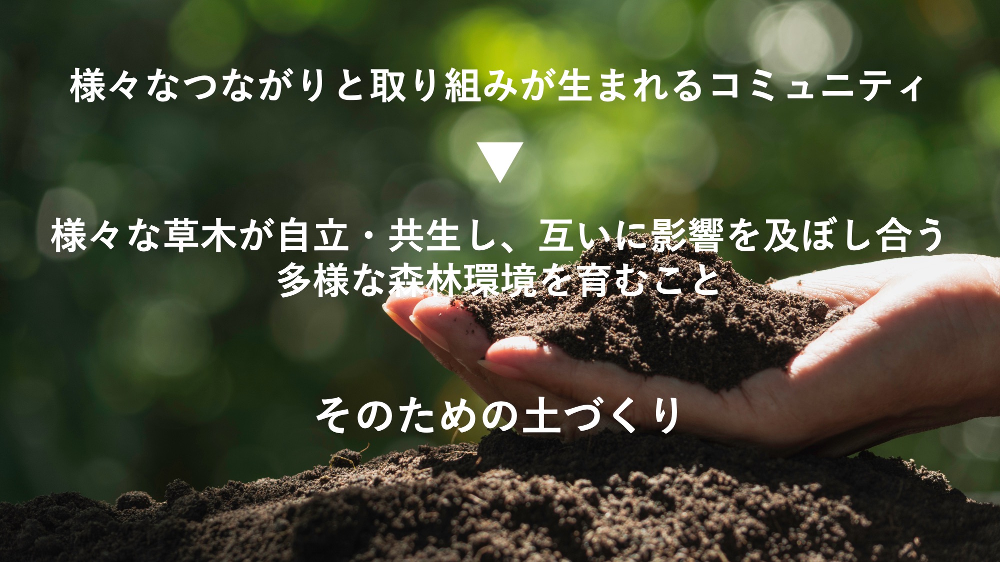 運営者は管理(マネジメント)するのではなく、生態系が育つ良い土や栄養を用意する存在。いわば、土の下でせっせと土を耕し、酸素を送り込むミミズのような役割です。土が良い状態であれば、生態系の行末は生態系自らが決めていきます。