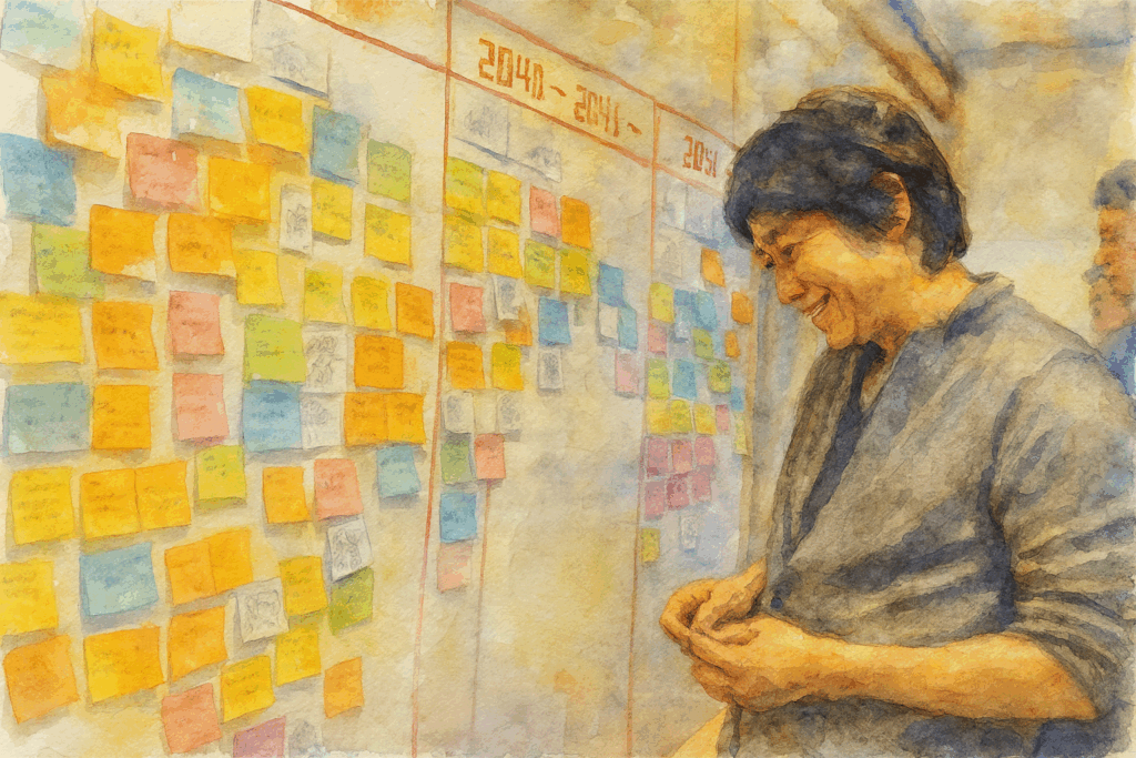 この問いをイメージして、とにかく自分たちの妄想をふせんに書き出していく。そして、それを年表のような形で時間軸ごとにプロットしていく。書き出してみると、ただ並べただけだと当然、飛躍も矛盾もある。
