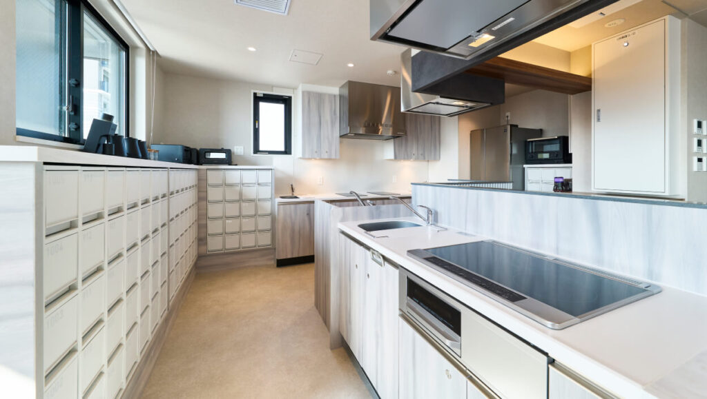 建物の中には専属の運営スタッフが介在する広いコワーキングスペースやリビングを設けて他者の気配を感じられるようにしつつも、すべての居室にはシャワー、トイレ、洗面台の水まわりを完備し、プライバシーも確保できる設計になっています。