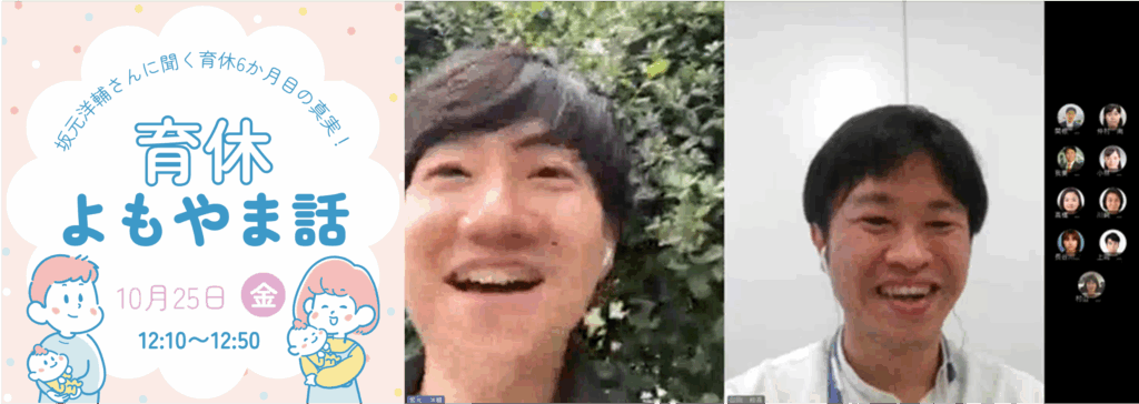 育休真っ最中だった第2回は、会社の昼休みの時間帯にあわせて、坂元さんには家からオンライン参加で語ってもらいました。