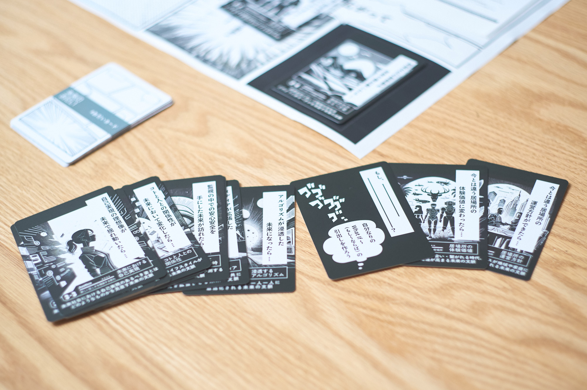 カードを組み合わせることで現在の枠を取り払うことで発想を広げていくワークショップです。すでに存在する技術などの事例から未来の兆しを発想したいときに活用しています。