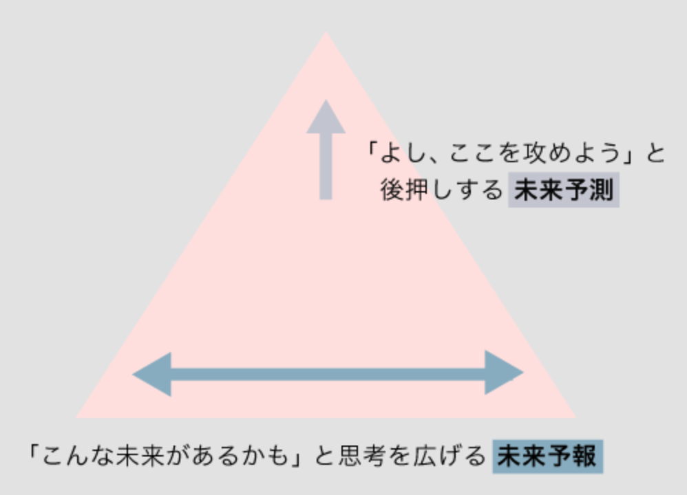 一方、未来予報は現在起こっていることやみんながわかる未来から少し枠を広げて、「こういう未来があるかも?」という範囲まで思考を広げます。