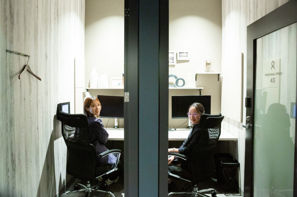 一方、オープンスペースにある半個室エリアは、背面が見えないように設計されていて、開放感とセキュリティ面での安心感を両立しています。