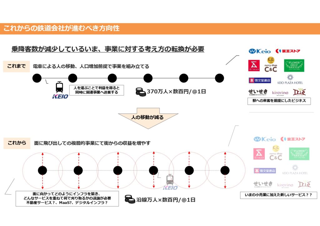 私たち鉄道会社は駅に集まる人たちに向けてグループの不動産や小売・流通業での商売をしてきましたが、これからはもっとまちにひらいて、地域の人と一緒にまちを盛り上げる必要があります。