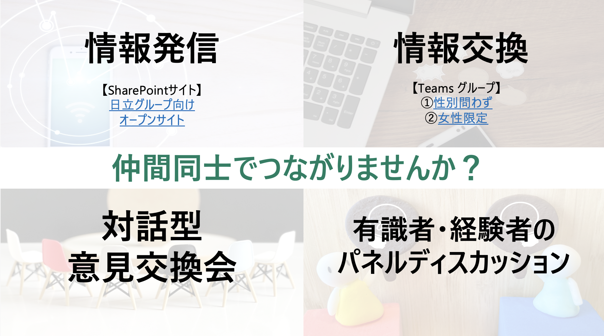 男性の社員も参加可能ですが、女性だけの方が話しやすい話題は女性限定に。日立が変われば、日本も変わる。そんな気持ちでこれからも活動を続けていきたいと考えています。